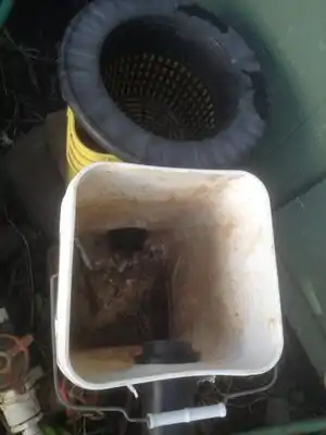 - FIRST GREASE TRAP BUCKET: Inside this bucket is a screen 3"-4" deep. Grease is trapped at the top of the screen which contains straw and other grease absorbing plants. Less greasy water remains at the bottom of the bucket and passes into the second bucket through a pipe 1" above the bottom of the bucket.