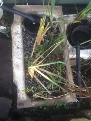 Tub Two : The water entering from tub one then drains into tub two where a similar set up as tub one is in place; however, smaller gravel and large rooted plants(e.g. blue iris) were used. Once the water travels to the opposite end of the tub, water flows out of the tub and through a connection where water can drain, or a hose can be attached.