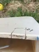 - Using an angle grinder donated by the sanctuary, a square cutting is made in the back of the toilet tank. Safety masks are worn to avoid damaging the lungs from grinding the porcelain with the masonry saw blade. The square cutting is measured just enough so that the PVC piping fits without having a lifted toilet tank lid.