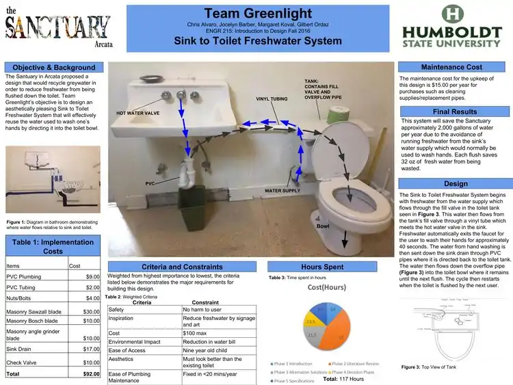 The toilet to sink greywater system is a system implemented by Team Greenlight in Fall 2016 in the men's bathroom for their client, the Sanctuary located in Arcata, California. Team Greenlight includes Chris Alvaro, Jocelyn Barber, Margaret Koval, and Gilbert Ordaz. The Sanctuary is a non-profit organization that promotes green technology, art, community involvement and sustainable living by the reuse of every day resources and items. The Sanctuary's objective was to remodel a bathroom that would reduce freshwater usage while at the same time inspiring the user to continue reducing their own personal freshwater usage outside of the Sanctuary.