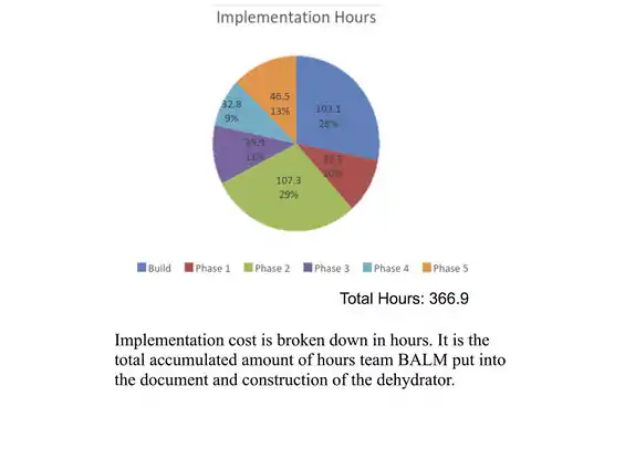 The total amount of hours that team BALM spent on making the dehydrator came out to be 366.5. Team BALM has recommendations in building this dehydrator that will be of use in replication of the design. The recommendations that are of high priority for future construction are the following. First, when gathering materials inspect plywood for warping, the materials must be level; this makes lining up components such as the door and the solar heat collector a lot easier. Another recommendation is having the tray sizes set up before construction; in doing so it will make the construction smoother. Lastly, make a full diagram before starting construction. This would have made the process smoother. By doing so if a size change or anything of that nature occurs, it can easily keep the desired dimensions and recalculate sizes.
