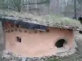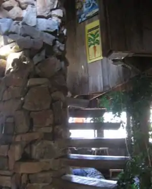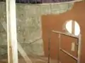 half sunhouse. the chimeny for the oven is also the stairs to upstairs.