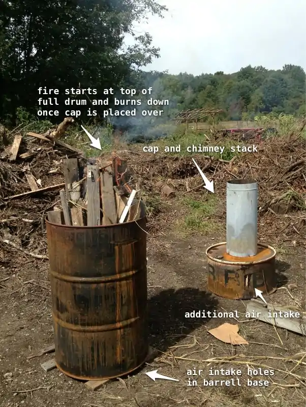 A fire is kindled at the top of the open loaded drum, until a good blaze has begun to spread through the exposed material. Then, the cap piece is fitted over this fire to create a substantial draft through the chimney column.