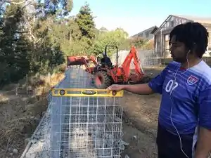 Our solution to our project needs was a 66'x2'x4' cubic foot gabion gravity wall. Essentially a gabion gravity wall is array of cages built out of galvanized wire that are designed to hold a large amount of rocks. Once filled with rocks the gabions are practically unmovable due to their massive weight. To assure that the gabions would hold in place a layer of angular rocks was set as a base and the gabions were placed slightly angled toward the soil that makes up the garden landscape. Installing the new wall allowed for us to double the surface area of leveled off gardening space.