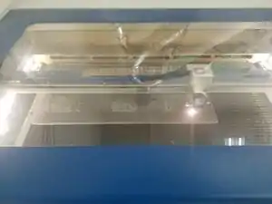 - Center the tile in the laser in the correct location and adjust focus settings for the laser engraver (intensity, speed, and material thickness.)