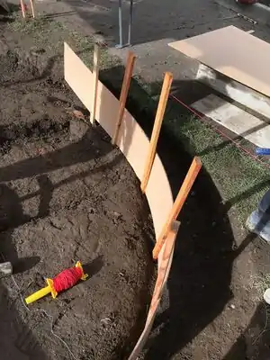 Start of the curve - The masonite sheet was then drilled into each stake to establish the right curve.