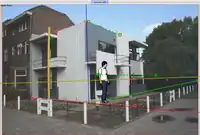 It is intended that we clearify to SketchUp on how the perspective runs in the picture. To do so, we place the green and red axises on the countours of the building. (for example: the ridge of a roof, a gutter, the bottom of the windows, ...). The placement is done by dragging the end points of the red and the green axises. It is also the intention that the origin of the axises (yellow rectangle) is positioned on a logical place: usually on a corner of the building.