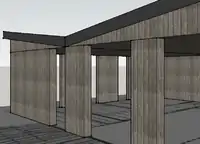 We apply the material: fencing_weathered (fencing-collection) to all of our groups. Only 2 roof halves get a different material: dark grey, color_007 (colors-collection).