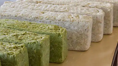 Chemically, soap is made by reacting fat with lye ("saponification"), and when finished may be solid or semi-liquid. Soap may be made from animal fats such as lard from pigs or vegetable oils (vegetable fats) such as olive oil, coconut oil, or palm oil.