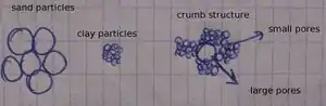 Crumb structure: the soil grains stick together and form soil crumbs with rounded shapes pile together without any order, similar to breadcrumbs. It is an aduquate structure because the presence of binding substances (humus and clay) contain upto 60% pores so that c a good air-water ratio arises.