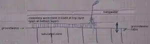 - Hanging water: The portion above the capillary zone contains water that, during seepage, kept hanging in the fine pores or got stuck in the colloidal particles. (sandy soils have little or no hanging water, clayish and loamy soils have a lot therof)