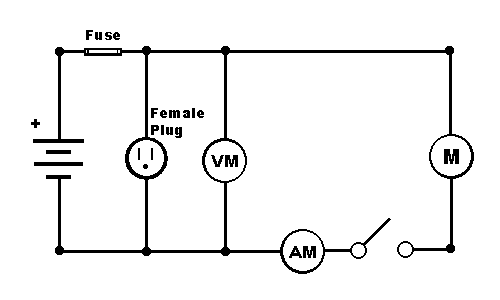 Lets start with the wire sizing. Wires are sized by gauge, the smaller the gauge the larger the wire. The Dayton 3/4HP motor pulls 58A according to the spec sheet. It turns out that a #6 wire is rated to handle 75 amps so that's what I used to connect the motor to the battery through the amp meter and switch (see wire diagram below). I used a 16 AWG wire to connect the voltmeter to the battery and a 16 AWG medium duty extension cord to connect the battery to the charging station. According to the extension cord label it could handle up to 13 amps. This should be more than enough for the .63 amps the solar panel puts out.
