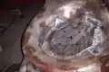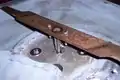 After stripping the mower and removing the engine I was left with a mower deck with a huge hole in it. I went to a local scrap yard and found a couple of small sheets of stainless steel about 1/16" thick. I then cut the steel to the proper size to cover the hole in the deck. Before welding the new stainless steel deck to the mower I drilled five holes; one in the center to allow the shaft of the motor to sit under the deck and four more around the center hole to allow the motor to be mounted to the deck. It was important to make sure the center shaft hole is centered on the mower. If the shaft is not centered when the blade is mounted to the shaft it could rub against the sidewall of the mower. After the holes were properly measured and drilled I carefully welded the steel over the existing hole in the mower. There were still a few spots where rust had eaten through the mower so I cut some additional pieces of steel to weld over the smaller rust holes. These patches can be seen in the image on the lower left. The 1/16" stainless steel worked well for this application. It is thick enough to support the motor and fairly easy to work with when the proper tools are used.