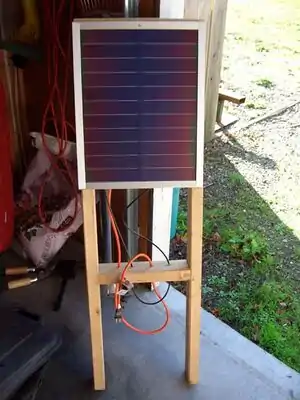 I also have a 12V 4.5A charge controller from a past project. This is wired between the solar panel and the battery. The controller stops the battery from discharging through the solar panel when the sun is not out and the panel is not creating electricity. It also regulates the voltage to the battery. Varying voltage to the battery can significantly shorten the battery's life span. (See below for details on parts and cost).