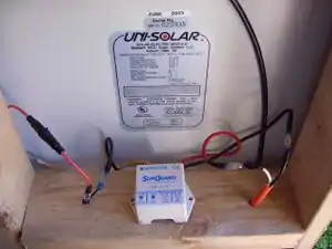 I also mounted a Morningstar SunGuard charge controller on to one of the cross supports. It is hidden behind the solar panel to protect it from the weather. (see picture at top of page "Charge Controller")