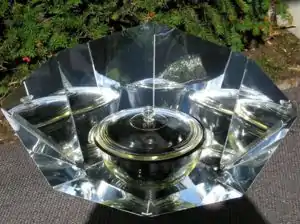 The third and most recent design is the panel cooker. Its major features are low cost and increased portability, as the panels are hinged and can be folded up. Invented by Dr. Roger Bernard, it was initially adapted by Solar Cookers International for use in refugee camps. A commercial model developed by Solar Household Energy, Inc. is now available. In this model, called the HotPot, a black steel cooking pot with a wide flange is suspended inside a transparent glass bowl with a space of 1.3cm between the two. This assembly is covered with a glass lid and placed in front of a foldable reflector designed to deliver solar energy through the glass bowl to the black pot. The resultant heat is retained between bowl and pot by the pot’s flange (Figure 4).