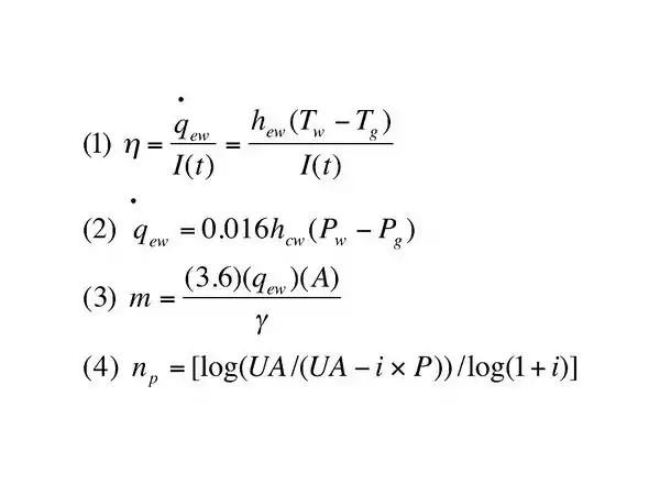 Eqn. (1) from the above describes the instantaneous thermal efficiency in relation to the evaporative heat transfer rate from the water surface to the glass cover the solar radiation intensity. Eqn.(2) represents the evaporative heat transfer rate from Eqn. (1) and its relationship to product of the convective heat transfer coefficient from the water surface to glass difference between the partial vapor pressure of water and gas. Eqn.(3) is the equation for determining the monthly output of distillate. Eqn.(4) was developed to describe the pay back period, np as a function of the Unacost, or the uniform end-of-year annual amount with P being the initial cost and i the interest rate.