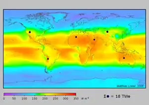 Solar radiation reaches the Earth's upper atmosphere at a rate of 1366 watts per square meter (W/m2).[1] Map A shows how the solar energy varies in different latitudes.