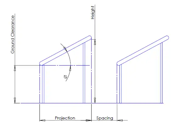 | Racking System with ref. to spec. | Manufacturer | Degrees of Freedom (fixed, multi, 1 axis, 2 axis) | Type (pole mounted, trays, etc) | Ground Clearance (m) | Height (m) | Materials (weight/m2 PV) | Notes |