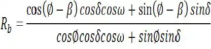 Translating the beam radiation onto the plane of the panels is a fairly straightforward matter of geometry. The factor Rb is the ratio of in plane beam to horizontal beam (Ib), and is given by: