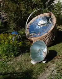 - Ceramic parabolic domes might be made using the stadium light reflector as a template while employing a clay coiling technique. After firing, bits of broken glass mirror could be adhered to the concave (interior) side. This would be a good type of stationary garden solar cooker because of its weight and because of its appearance. Patterns of colored bits of glass or tile could be used to create an artistic mandala. A rounded shape given to the convex side (outside) of the vertex would permit the cooker to manually track the sun i.e. to pivot and tilt (Rock And Roll!). AND, of course, it would make a nice addition to the White House Organic Garden.