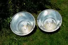 Stadium light reflector hoods function as solar cookers and drinking water pasteurizers. When aimed at the sun the parabolic reflector works in reverse, by focusing concentrated sunlight to a black pot set approximately where the light bulb normally is. The reflectors are readily found in industrialized societies, in cities that have athletic stadiums. The lighting systems are replaced about once every 15 to 20 years and the reflectors can be obtained by contacting the managers of the sports stadiums and by checking at local recycling centers and metal scrap yards. The reflectors hoods are ready to function as parabolic solar cookers without significant modification. In non developed countries these parabolic reflectors could be used as templates for teaching villagers and refugees how baskets and ceramic pots can be made in that parabolic shape, lined with reflective materials and used as solar cookers and water pasteurizers.