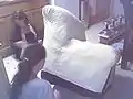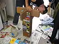 The stools were made by gluing 16 inch by 19 inch hand cut pieces of cardboard together. Some pieces were two ply and other one ply. The plies were alternated 90 degrees on every piece. One stool has 68 pieces and the other has 78 pieces. The stools have different thicknesses, 14 inches and 15.5 inches. The sides of the stools were decorated with a decoupage of appropriate technology pictures, using glycerin based glue.