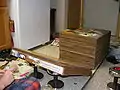 There 2 types of upholstery fabric. The first was a black piece that was purchased from a thrift store for $1. This piece was used on the bottom, but it extends up 3 inches on either side. The other piece is neutral hemp purchased for $12.99 per yard from Eureka Fabrics. 4 yards were purchased. The fabric was 60 inches wide. The fabric was draped over the chair and pinned to the bottom piece. Folds were made and pinned on the sides which would become the seams. The fabric was hand stitched with and double loop stitch, followed by a straight stitch. 1 yard of fabric was left over. The front of the chair has flap that can be lifted so that the ribs and bracing members can be seen.
