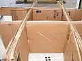 The feet were made by gluing 13 pieces of alternating plies of cardboard together. There are two pieces that are 19.5 inches long, 5.5 inches wide and 1.75 inches thick. Each piece was notched in the center by hand to receive the other piece, forming a cross which supports the stem.