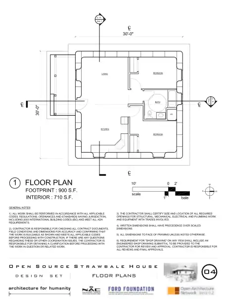 This simple Open Source home design grew out of a desire to share a easy-to-construct straw bale prototype for humanitarian applications. The barrier-free floor plan, comprised of a concentrated wet core within an insulating straw bale envelope, allows for an efficient layout within a small footprint. This system can scale up or down, orient to solar and wind patterns for passive heating and cooling, and be partitioned flexibly in order to adapt to changing inhabitant needs.