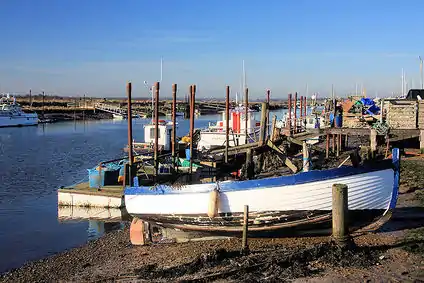 Southwold Harbour. The vertical posts are used to anchor mooring platforms or pontoons. Various types of boats frequent this busy harbour, but most are concerned with fishing activities. December 2008. Attribution: Bob Jones