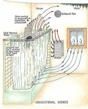 The design features of a conventional shower minimize thermal comfort, maximize energy use and water consumption while exacerbating moisture problems. Most of these negative effects are caused by evaporation. As small droplets of water fall from the showerhead, the high surface area and velocity of the particles of hot water experience conditions, which maximize evaporative cooling of the droplets. Water saving showerheads that produce exceptionally small water particles can actually further increase evaporation. Water Particles can be cooled by as much as 30ºF / 17ºC as they fall from the showerhead to the ground. Evaporation is also accelerated by convective air currents and low humidity. With the shower curtain in place, a shower area can act as a thermal chimney. Cold air enters from below the curtain; then rises as it is heated by the walls of the shower stall, falling particles of hot water, and the shower’s occupant. The humidity of the moving air is kept low by condensing its moisture load on cold surfaces in the bathroom. This often results in mold growth, rotting walls or ceilings, and wet insulation; a problem that can be particularly acute in straw bale construction.