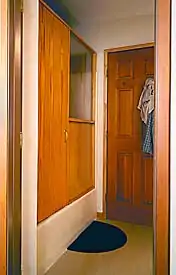 A fiberglass tub/shower combination in my home was sealed with plywood and Plexiglas. This configuration allows for a comfortable shower when the air in my bathroom dips to 50ºF/10ºC. After showering, I can dry off in the warmed up shower. A vent is opened in the ceiling to dry off the interior. This arrangement allows me to take a comfortable shower in a cold bathroom while using only 1/2 gallon /1,89 liters of water per minute. Many showers use a much as 3 gallons /11,36 liters of water per minute.