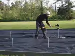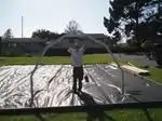 The first step was to paint the necessary number of boards for construction to prevent the degradation of the poly film. We painted 90’ of 2”x4” and 144’ of 1”x4”. Then begin by assembling the greenhouse hoop ends. This is where our design was different from instructions provided. We framed the ends with seven angled cut 2”x4”s instead of following the instructions which called for plywood. This in turn changed the design of the doorway. Next we attached the steel hoop frame to the 2”x4” frame with hoop clamps and carriage bolts. Once the structural ends were built we began to sink the anchor posts in, beginning with one end. We placed the two end corners 9’11” apart and worked our way down each side, driving stakes 4’ apart until we had each anchor post staked in the ground. For a top ridgepole we sandwiched together three 1”x4” boards. The top board was cut to be 2” shorter than the length of the greenhouse. The two middle boards for the end sections were cut to 3’11-3/8” and the other middle two sections were cut to 3’10-3/4”. The bottom board is the length of the greenhouse. To adhere the three boards together we used 3” carriage bolts. In each four-foot section two carriage bolts were driven down the length of the greenhouse. Next we applied stabilizing wires. They run from the center top of each end to the bottom corner of the opposing end. This reduced some tension on the steel frame construction. For side structural reinforcement we applied three 1”x4” boards to the length of the steel framing. They are attached with d-hoop clamps and carriage bolts. The lowest one is nearly on the ground. The mid-board is 22” up the lowest. The highest is another 42” up. The third 1”x4” was an additional support. This completed the greenhouse frame. The last thing we did was frame in the end doorways with vertical 2”x4”s, 36” wide from center. They attached to the upper hoop arch and to a lower 2”x4” baseboard. (see picture) The poly film cover was pulled over the greenhouse (see picture). Then the film was adhered by 3/8” staples through batten tape to protect the ploy film from ripping against the staples. We begin on one side and in one lower corner pulling tension while the other person stapled. The end plastic pieces were done the same way beginning in the lower corners.