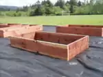 All the redwood-raised beds in the entire garden plot are sealed with pure linseed oil for increased protection to weathering and decay. The bed sizes are 2'x5' in the greenhouse and 3'x6' and 3'x7' outside. They were constructed by screwing the corners together, capping in the short dimension boards. Then to reinforce the bed placement we attached rebar to the beds with clamps.