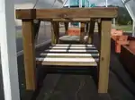 The tables are designed with seedlings, plant propagation, and storage in mind. They are two 3’x6’ tables with mesh screening tops. They provide good drainage and a firm surface. The tables top is a 2”x4” frame. Within the frame is a mid rib support half in between the ends. Attached to the mid rib are four other mid rib to end supports, two on each side . Underneath the table is a platform of 1”x4” boards for storage of pots, flats, tools, etc. For extra solidity the table’s legs are made from 4”x4”s.
