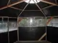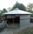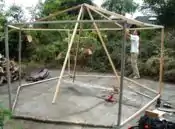 After looking at way too many of other people's roof designs and even building a miniature model I decided on my own creation. I wanted a roof that was all one piece, hence seamless(=rainproof) and it had to be tight fitting so rain wouldn't puddle. This was achieved by cutting out a 20' diameter circle and punching a hole in the very center for the bolt of the apex bracket to fit into. Then I wrestled the beast onto the structure and inserted the bolt into the hole I punched. I then proceeded to staple (use stainless steel staples) the tarp to the vertices. I would pull the tarp tight against the bolt and away from the last vertex to eliminate lateral and vertical slack. I continued around the whole structure, in essence making a cone, until I reached the starting point and had an extra fold of tarp (from all the slack being pulled out elsewhere). I folded this over tightly and marked it so I would know where the fold was when I took it back off to tape (inside and out) the fold closed. I then cut out a hole for my skylight (~3' diam hexagon) and pulled the tarp back off. The fold was taped as well as the border of the skylight with Gorilla tape (like duct tape but much stronger). I also put in 12 grommets along the circumference of the skylight to further tighten the roof cover with rope once it was stapled on. Again I wrestled the tarp back on (it truly is wrestling), stapling it tightly in place. Then I installed hooks on the top side of the rafters and used rope threaded through the grommets and the hooks to tighten the tarp upwards against the eves. Voilá! Done… with the roof that is. I actually also grommeted each vertex pt. on the eve and tightened down in the same manner as the skylight opening, hooks and all.