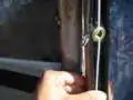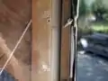 Close-up of to-be-improved door closure system. Washers threaded onto door with rope.