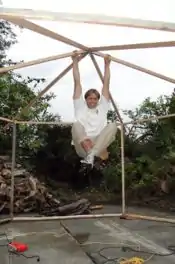 Three rafters were attached to the top layer of the apex bracket only (see "Top view of roof apex bracket" figure above). The remaining rafters were used to support the apex while I screwed them the the vertices of the structure (Aaron wasn't much help, although he's a great supervisor. Russ, buddy, you better make sure this page is on your watchlist, because I will strike back when you least expect it!--Aaron 22:44, 26 November 2006 (PST)). I gave them 1.5' of overhang from the walls to create an eve. Once they were in place I screwed in the bottom portion of the apex bracket. Then I attached the remaining three rafters in the same manner. This forces the structure into a perfect hexagon and can support a substantial amount of weight (see below). Cutting the eve pieces to connect them to the ends of the rafters was more easily said than done. It required funky angled cuts to achieve a snug fit with the rafters. I found the best tool for this was a folding hand saw. I used the scraps from this to incorporate parallel pieces about 3.5' from the roof apex.