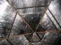 Insulating the ceiling took a little more forethought. At first I was going to use the same method as I used cutting out the roof material. This would entail laying out enough insulation in strips and taping them together so that I could cut out a 20' diameter circle. Then I thought of an even better solution that creates much less waste (< 1 square foot). The roof is comprised of triangles. If you take a set of triangles (in this case 6), any isosceles triangles will do, and flip alternating ones over you'll get a parallelogram. Cut a right triangle off of either end, flip it over, place it on the other end and you've got a perfect rectangle. I started with a perfect rectangle, so just repeat the process in reverse! The 4' wide sheet of insulation was not enough so I laid down two strips, taped them together and cut the triangles out of this. If this sounds complicated don't be alarmed: see diagram below. Also, these were not full triangles because the skylight negated the need for the top portion of each triangle. Therefore an approx. 26" strip was removed from the whole length. Luckily for me this material was the perfect amount I needed to make curtains for my two largest windows.