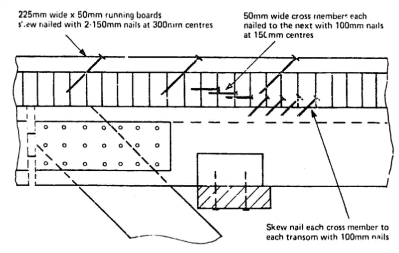 Of several designs tried by Mr Collins for the deck the use of close nailed cross beams was preferred. This puts a larger dead weight on the trusses than using transoms or spaced cross beams but it also increases the bending resistance of the whole bridge. In this design the deck is a stress-carrying part of the assembly and it should be assembled to the trusses as shown in Figure 10. This type of deck is still popular for timber bridges in the USA. The cross beams used in Kenya are 75 mm or 100 mm deep. They are nailed into the spacing timbers between the top chords of the frames and to each other (Figure 10). Running boards, 50 mm deep are attached by nails or coach bolts to the cross beams. These running boards may be replaced when worn without disturbing the structure.