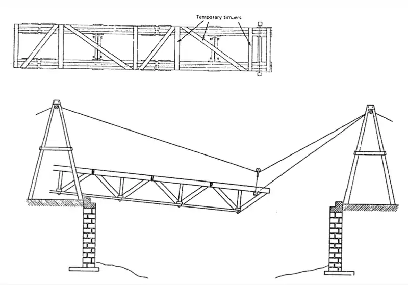 The first bridge constructed at Isiolo was built by hand, with each frame being bolted into position in its final place. This was done in the dry season and the method would not be practical for a crossing with deep water or across a ravine. Subsequent bridges were built without support from below using a timber derrick on each abutment with a wire rope stretched between them. The truss was then built up at one abutment and launched across the river; this was done in stages adding further frames until the full truss length was reached (Figure 11).