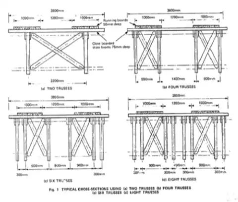 The trusses are connected by timber cross beams above, and diagonal bracing members, both vertical and horizontal, between the trusses. Longitudinal running boards are nailed to the cross beams (Figures 1 to 10). At their ends the trusses are supported by angle brackets (Figure 4), which act as the bridge bearings. Stone, concrete, brick or timber abutments may be used to support the brackets.