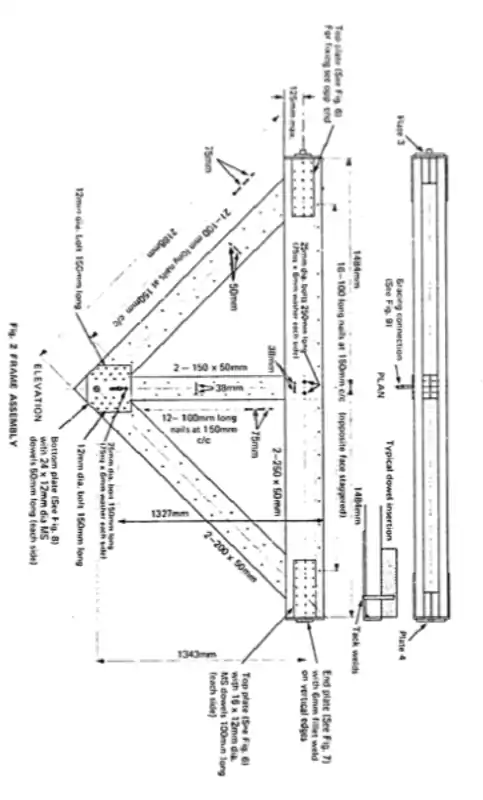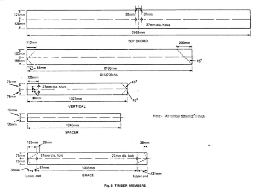The timber members of the frame are cut to the dimensions shown in Figure 5. It is important that lengths and angles are cut accurately, and for this reason it is recommended that simple jigs are used at this stage. Of equal importance is an assembly jig to ensure that all the frames are assembled to give constant length, depth between centers of the locating pins (1343 mm), and squareness of the end plate. The vertical struts should not project above the top surface of the top chords.
