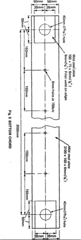 Although the location of the dowel holes in the drilled plates (Figures 6 and 8) is not very critical, a template for the pilot drilling saves time marking out and gives a consistent result. The 40 mm holes in the bottom chords (Figure 3) should be drilled accurately using a template.
