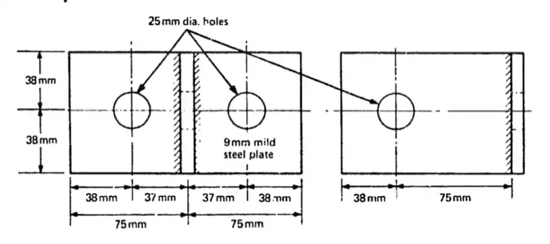 Steel dowels are used to join the timber members at each corner of the frame. The two top joints are identical, each consisting of two steel plates (Figure 6) one on each side, through which the dowels pass, penetrating through the horizontal timber member and then into the diagonal. There is no connection through the joint but the two top steel plates are joined when the end plate (Figure 7) is welded across them; a male end plate at one end of the frame and a female at the other.
