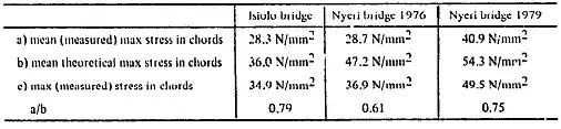 Analysis carried out at the University of Nairobi suggests that the steel used for the Kenyan bridges may be classed as a grade 43, according to British Standard Specification BS 4360: 1972, Specification for weldable structural steels.[3] Values of permissible stresses in the steelwork given by British Standard Specification BS 153: parts 3B and 4: 1972. Specification for steel girder bridges[4], (assuming that the steel meets the requirements of BS 4360[3]) are: