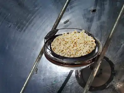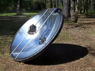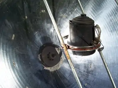 - 3/4 inch conduit struts supports bolted to a gimbaled steel bike rim laced with a steel wire from hangers configured to form a basket that positions a pot or pan slightly off focus, (3 inches below the actual focal point), to distribute concentrated sunlight evenly across the bottom cooking surfaces and prevent thermally induced structional damage. The energy density at the focal point is capable of buckling stainless steel sheet metal, cracking cast iron and melting aluminum.