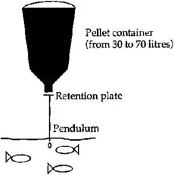 For smaller fish, clockwork-driven belt feeders are often used. This is basically a container equipped with a belt that is rolled by clockwork action on an axis. [It is also possible to fit such feeders with small electric motors.] Feed is placed on the belt that is going to roll up progressively during 10 hours (clock system) on its axis, releasing the feed slowly. It is a system that is particularly well adapted to small fish. These feeders can distribute 5 to 10 kg of food per day.