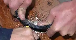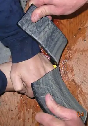 Now that I had a sheet of rubber all that was left to do was make the actual shingles. As you can see in Image 3 I used a piece of chalk to mark where I needed to make the cuts and this is a good time to have someone with you. I averaged 14 shingles per tire and the shingles were 5" x 8". My friends and I used a method that we called "the bend and spread". As you can see, below in Image4 the "bend" portion refers to actually bending the rubber strip to help keep the rubber from kinking while cutting. Image 5 is showing the spread part, while being cut the person bending the rubber should also help spread it so it is easier and faster to cut. I didn't time how long each individual tire took to cut, but with four people and in four hours we cut all 36 tires and made 460 shingles. I was very happy with the time results. Each tire produced about 2ft2.